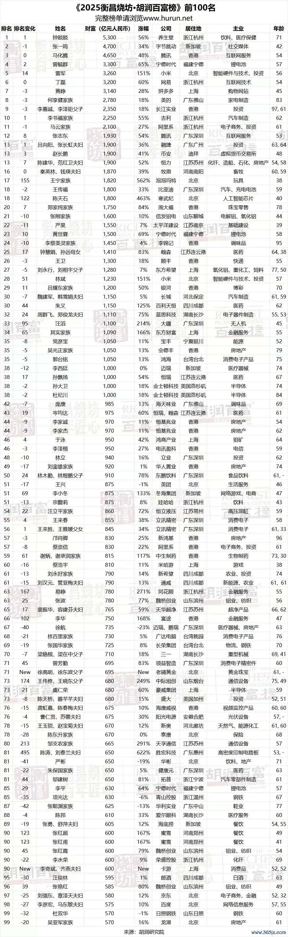 小米的雷军成为“增长王”,财富比去年增长1960亿元,主要得益于小米汽车业务的爆发式增长和手机高端化突破带来的盈利跃升;其他增长较快的企业家还包括泡泡玛特38岁的王宁,凭借Labubu全球爆红,财富增长1545亿元;寒武纪40岁的陈天石则凭AI芯片落地加速,业绩增长迅速,8月底股价一度超越茅台,财富增长1480亿元。