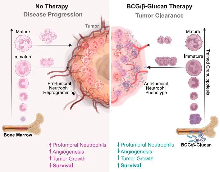 近年来,研究发现BCG可以通过重编程骨髓中的造血干细胞(HSC),增强宿主对感染和肿瘤的免疫反应。这种保护机制是通过骨髓中HSC的表观遗传重编程实现的,进而导致 中枢训练免疫 ( central trained immunity )的形成【2】。 类似地,在临床前模型和膀胱癌患者中,多次BCG灌注也被证明可以重编程造血干细胞和祖细胞(HSPC),促进长期的抗肿瘤训练免疫【3】。此外,β-葡聚糖(一种真菌细胞壁成分)也被证明可以诱导训练免疫。研究表明,β-葡聚糖能够重编程骨髓中的HSC,增强对感染和肿瘤的保护性反应。这种保护作用主要通过增强中性粒细胞的活性氧(ROS)生成来实现。β-葡聚糖通过调节粒细胞生成(granulopoiesis),影响中性粒细胞的成熟和功能,使其成为增强BCG基础免疫疗法的有吸引力的候选药物【4,5】。