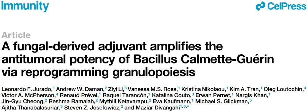 2025年6月23日,来着加拿大麦吉尔大学的Maziar Divangahi团队在Immunity上在线发表 了文章A fungal-derived adjuvant amplifies the antitumoral potency of Bacillus Calmette-Guérin via reprogramming granulopoiesis,证实卡介苗BCG联合β-葡聚糖(β-glucan)治疗可通过重编程粒细胞生成过程,诱导产生具有增强抗肿瘤活性的训练中性粒细胞,阻止其向促肿瘤表型转化,从而实现完全的肿瘤清除和生存率。这些发现支持了β-葡聚糖作为一种安全有效的佐剂,能够增强BCG在膀胱癌及其他实体瘤中的免疫治疗效果,这种联合免疫疗法有望成为实体瘤治疗的突破性策略。