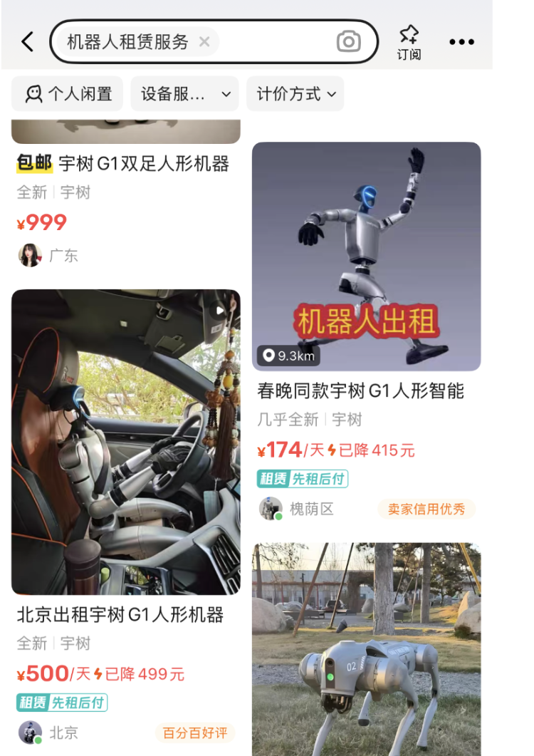 记者在闲鱼APP上搜索“机器人租赁”看到,租用宇树G1人形机器人的报价多在1000元——4000元/天不等,有不少链接显示已经降价了50%以上。机器狗租赁一天的价格在300元左右,都支持全国服务,一位卖家向记者介绍,租用一只机器狗3天以上收费是300多元一天,支持全国邮寄,“之前没操作过也不用担心,会配备说明书,也可以远程视频教你怎么操作。”