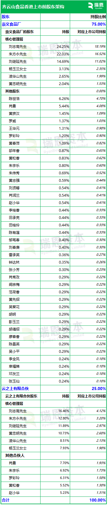 云之上有限合伙(崇义食品厂股东、公司雇员出资)持股25%。