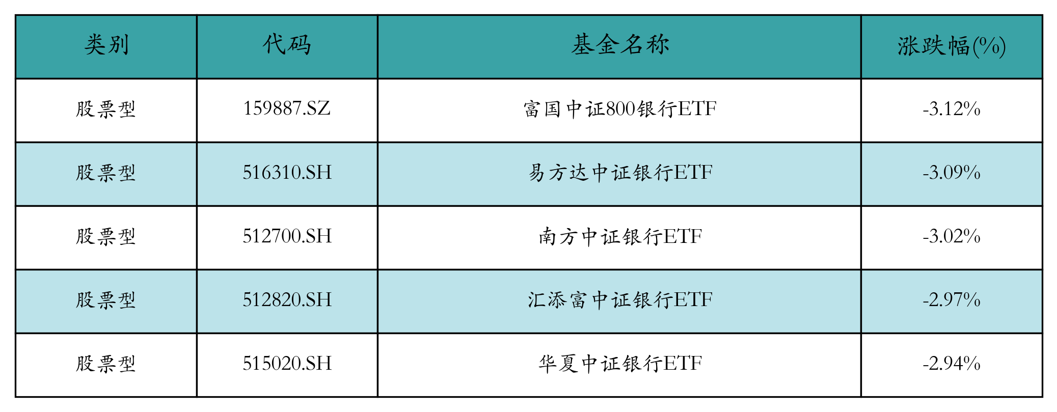 上周股票型ETF跌幅最大的5只ETF及其收益率分别为:富国中证800银行ETF(-3.12%)、易方达中证银行ETF(-3.09%)、南方中证银行ETF(-3.02%)、汇添富中证银行ETF(-2.97%)、华夏中证银行ETF(-2.94%)财盛证券。详情见下表: